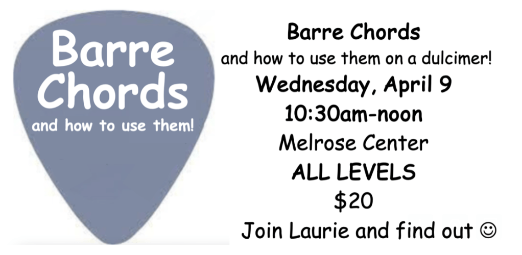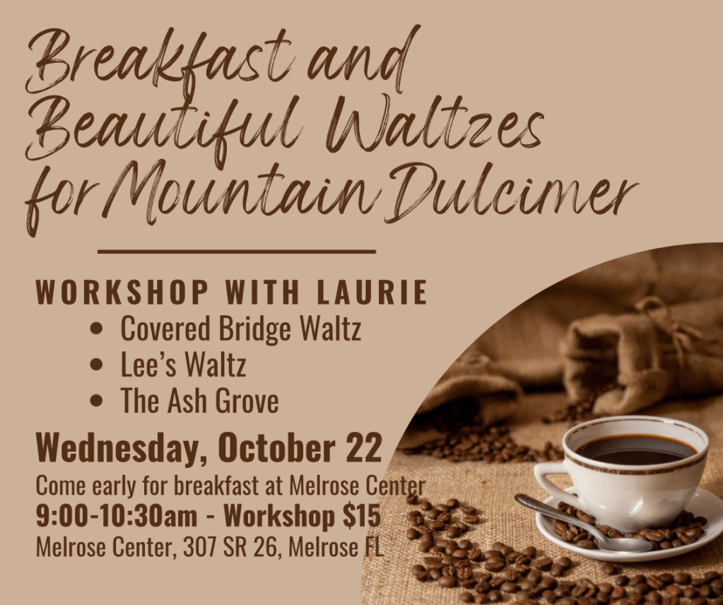 Intro to Mountain Dulcimer with Laurie Alsobrook: Laurie will bring her fishing cart filled with mountain dulcimers for you to try. We’ll learn our way around the fretboard while playing a few familiar tunes. Playing the mountain dulcimer is easier than you think…and more fun than you could imagine!